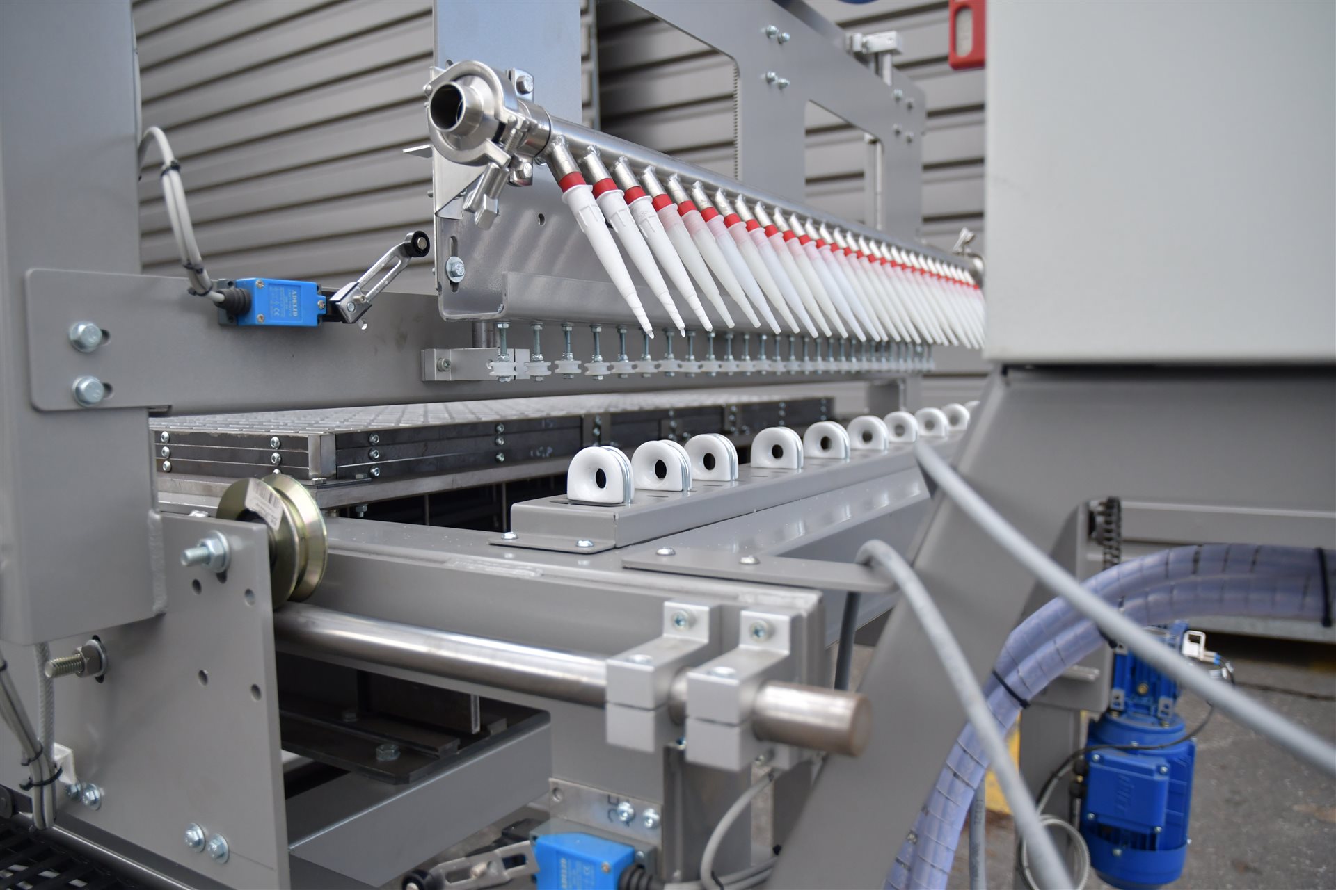 Po Etapie rozłożenia włókna szklanego w formie kraty, maszyna wykonuje etap dozowania żywicy do formy. Dozowanie żywicy odbywa się przy użyciu bramy przejezdnej, która dodatkowo wyposażona jest w mechanizm dozowania. Mechanizm zakończony jest kolektorem z dyszami dozującymi, które dozują żywicę poliestrową do formy wykonywanej kraty pomostowej. Kolektor z dyszami dozującymi odpowiada szerokości formy kraty, której efektem jest zalewanie całej szerokości formy kraty w jednym czasie co zapewnia jednorodną strukturę lepiszcza poprzez kaskadowe sieciowanie żywicy poliestrowej, co ogranicza powstawanie obszarów niejednorodności jak na przykład przylepień lepiszcza.